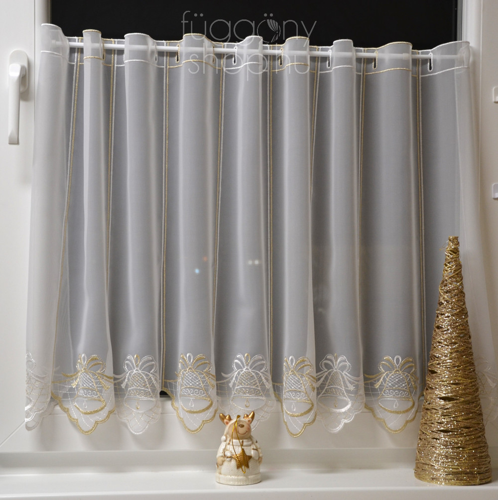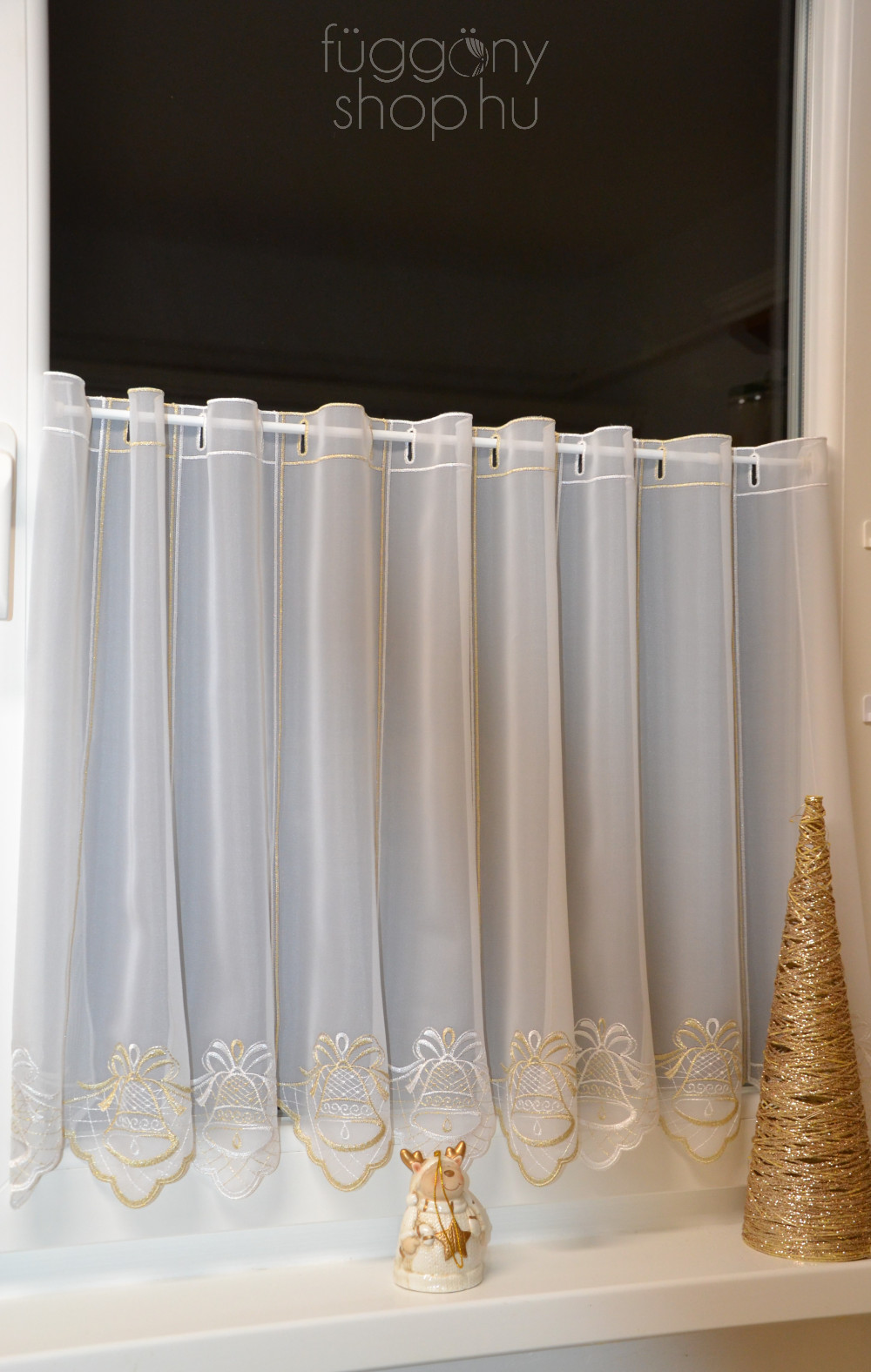 Karácsonyi mintás vitrázs függöny kis ablakra, mellyel ünnepi hangulatot varázsolhat. Fehér voile alapon arany és fehér harangokkal hímzett karácsonyi függöny. Méret: magasság: 60 cm
